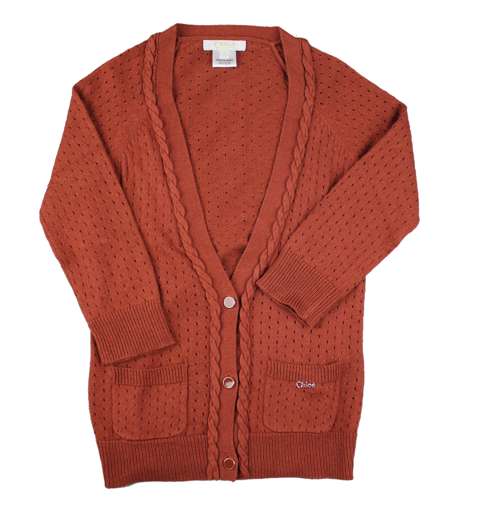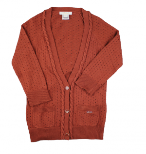 Grandpa cardigan with front cable knit details and two pockets at front.
