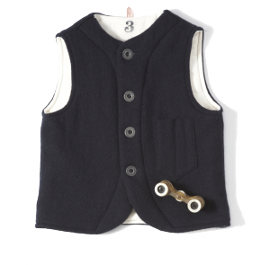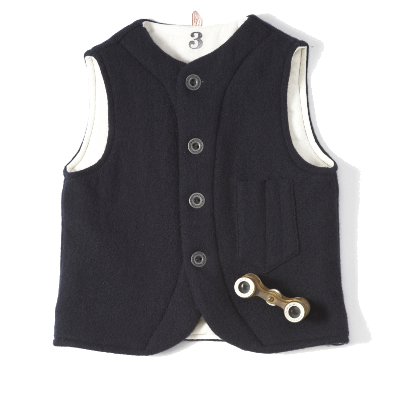 Washed wool worker vest inspired by workwear of the 1093's. Pure wool with quilted muslin lining, decorative piping, and metal buttons.