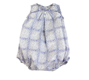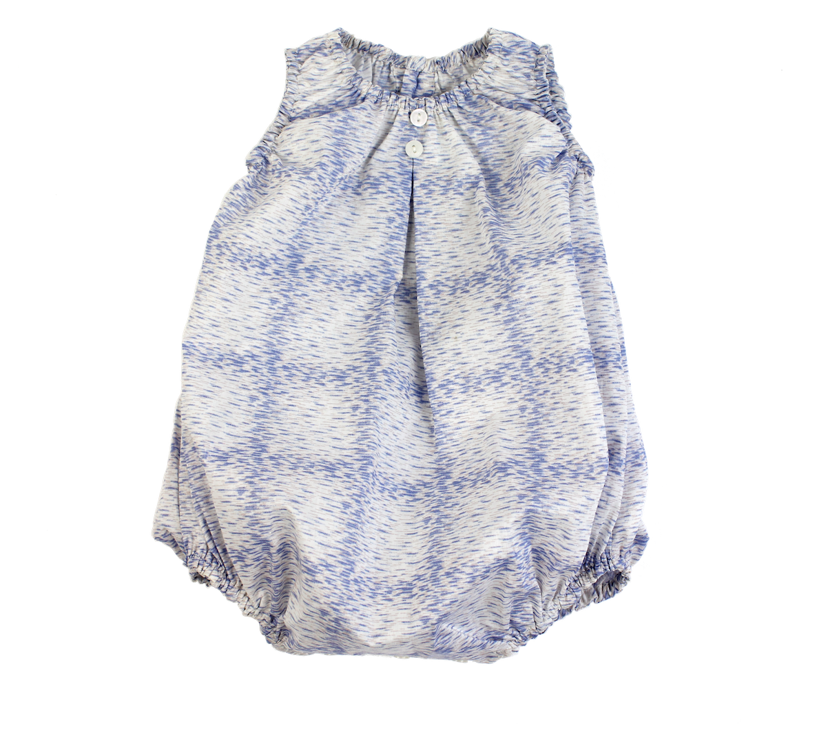 Sleeveless printed romper has elastic gathering at shoulder, collar and legs. two detail buttons up top and button closure at bottom. This product was produced by angele and her team of sewers in madagascar. Your purchase completes the positive cycle of empowering women and children in that community.