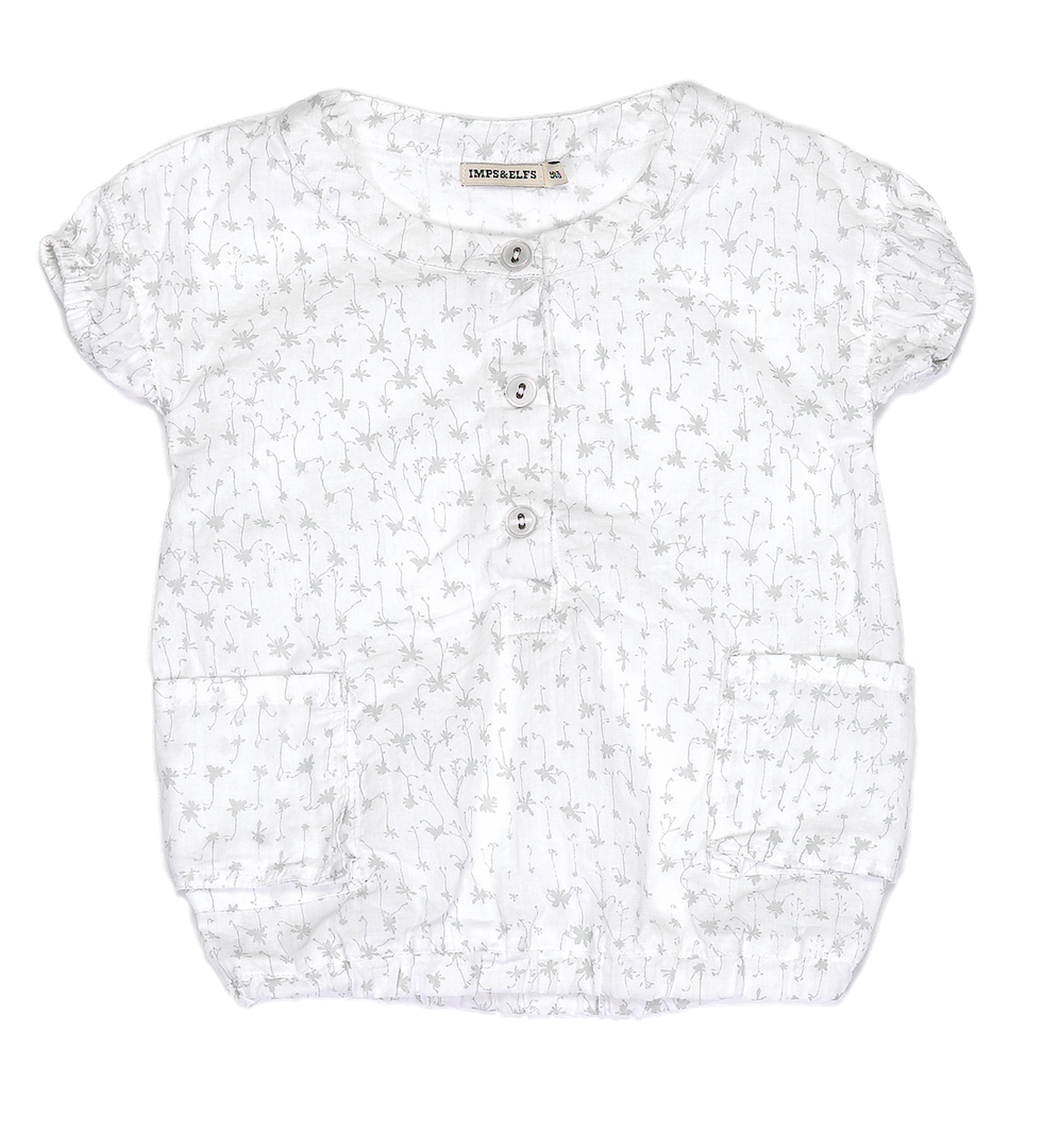 Printed bubble dress with patch pockets and cute puff sleeves.
