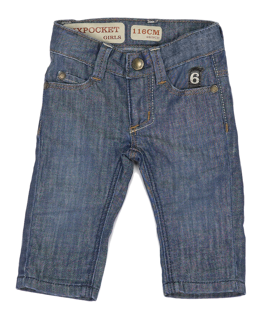 Straight leg indigo jeans with soft sandblast effect at thighs.