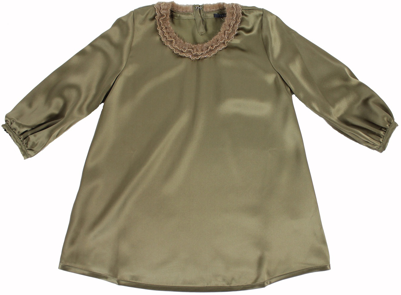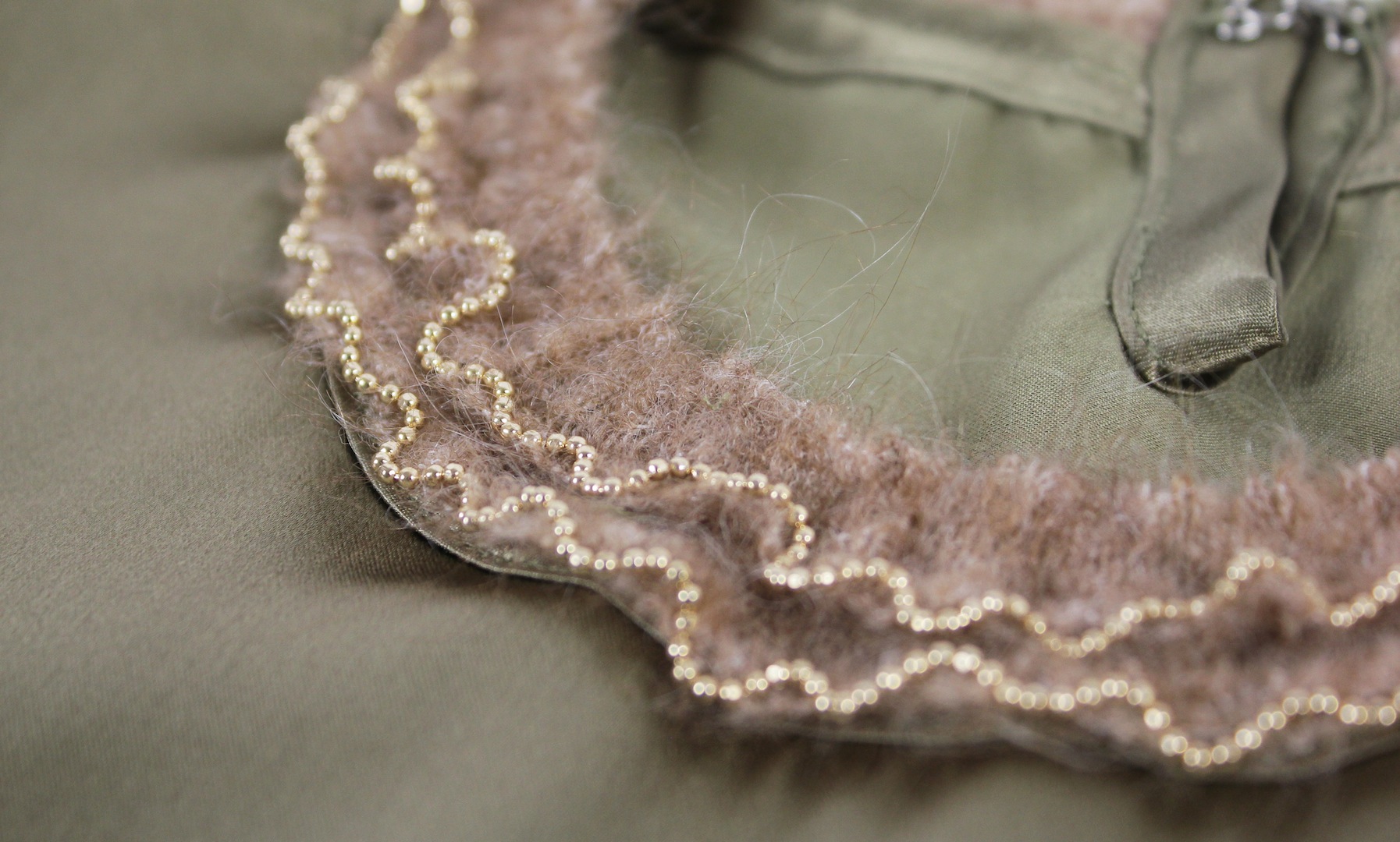 A-lined, long sleeve dress with wool ribbon appliqué at neckline.