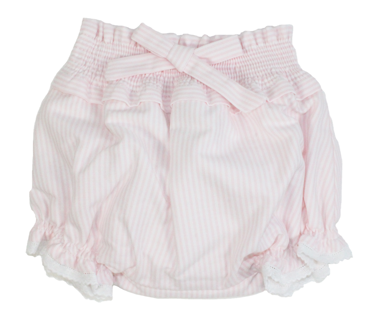 Smocked waist pinstripes culottes shorts with delicate lace at leg opening and cute bow at waist.