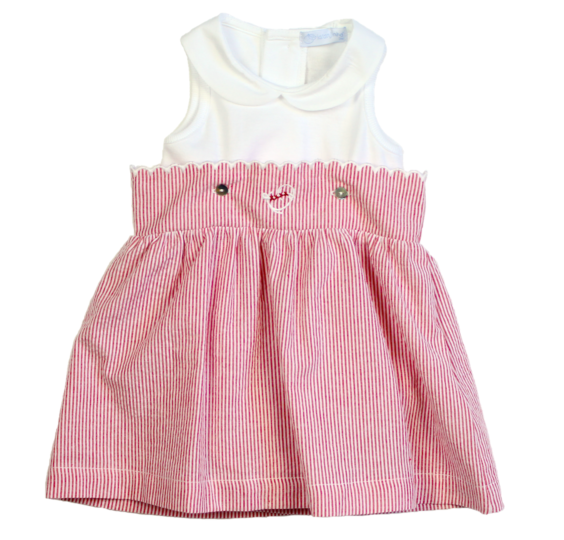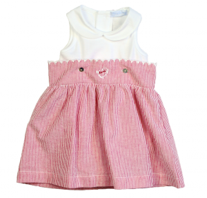 Full pinstriped skirt with scalloped waist edge. Includes sleeveless detachable onesie with peter pan collar.