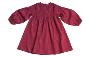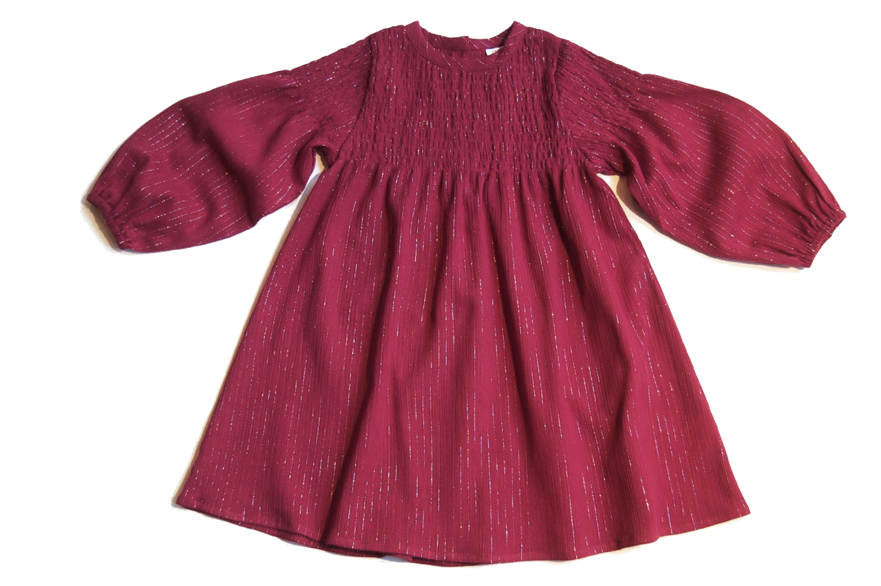 A-line long sleeve dress with silver Lurex stripes, smocked on the front, closed with one silver buttons at the back.