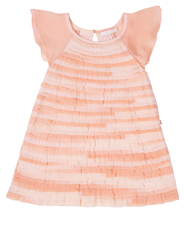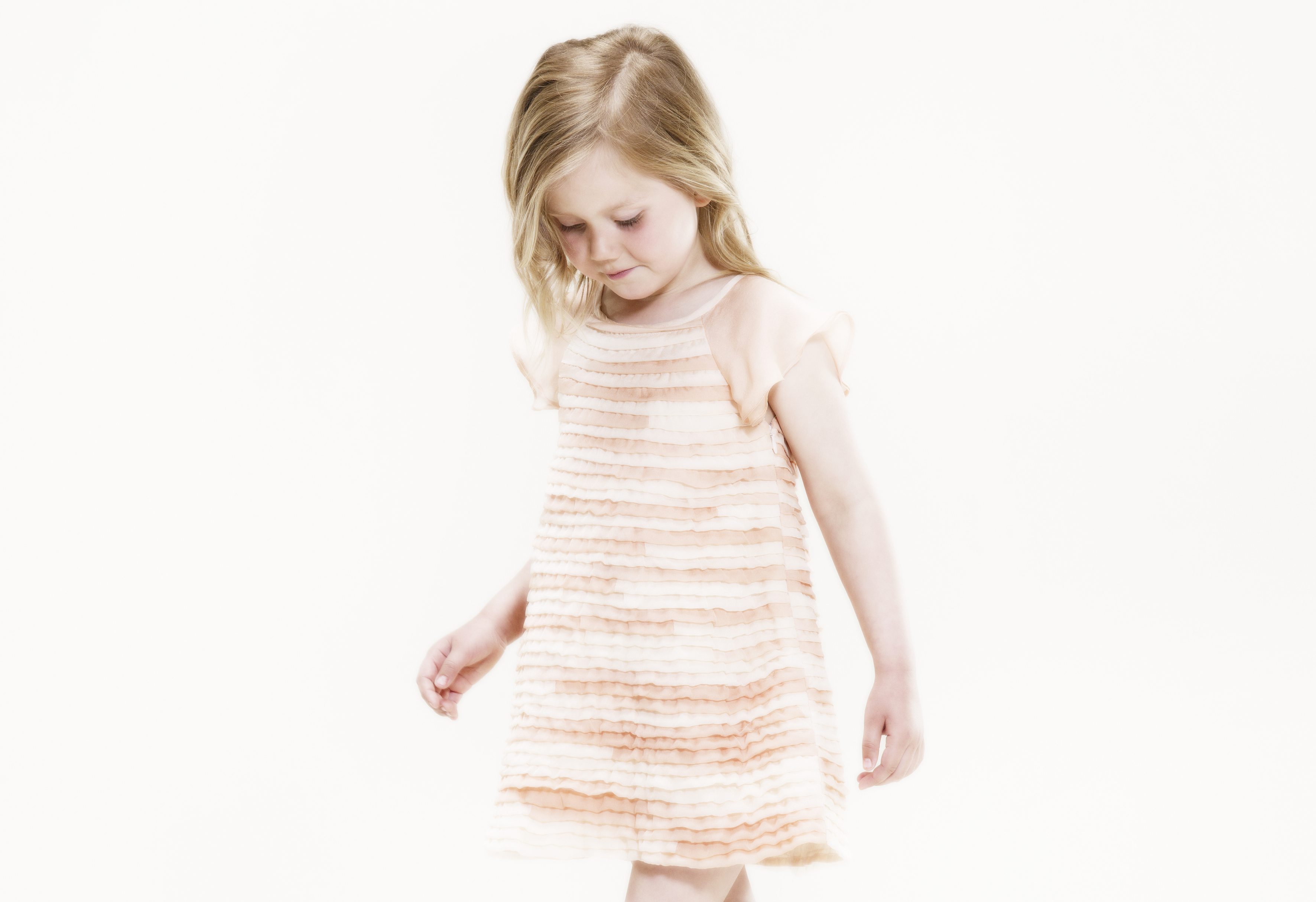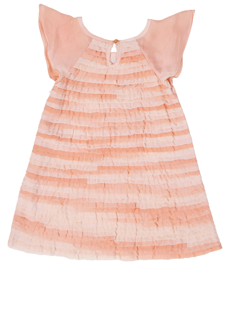 Silk Chiffon is cut into strips and hand dip dyed in two colours; the strips are then folded and constructed into the dress. This tailoring method means that each one of this very small run is completely individual!