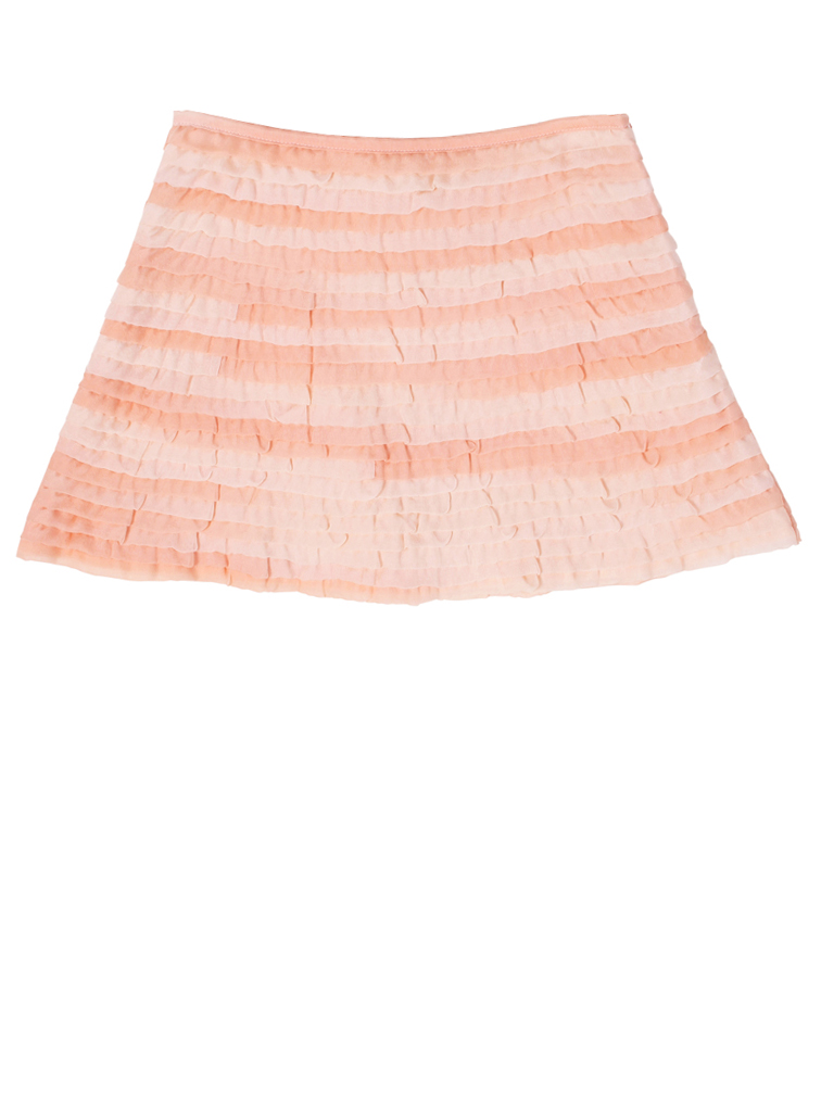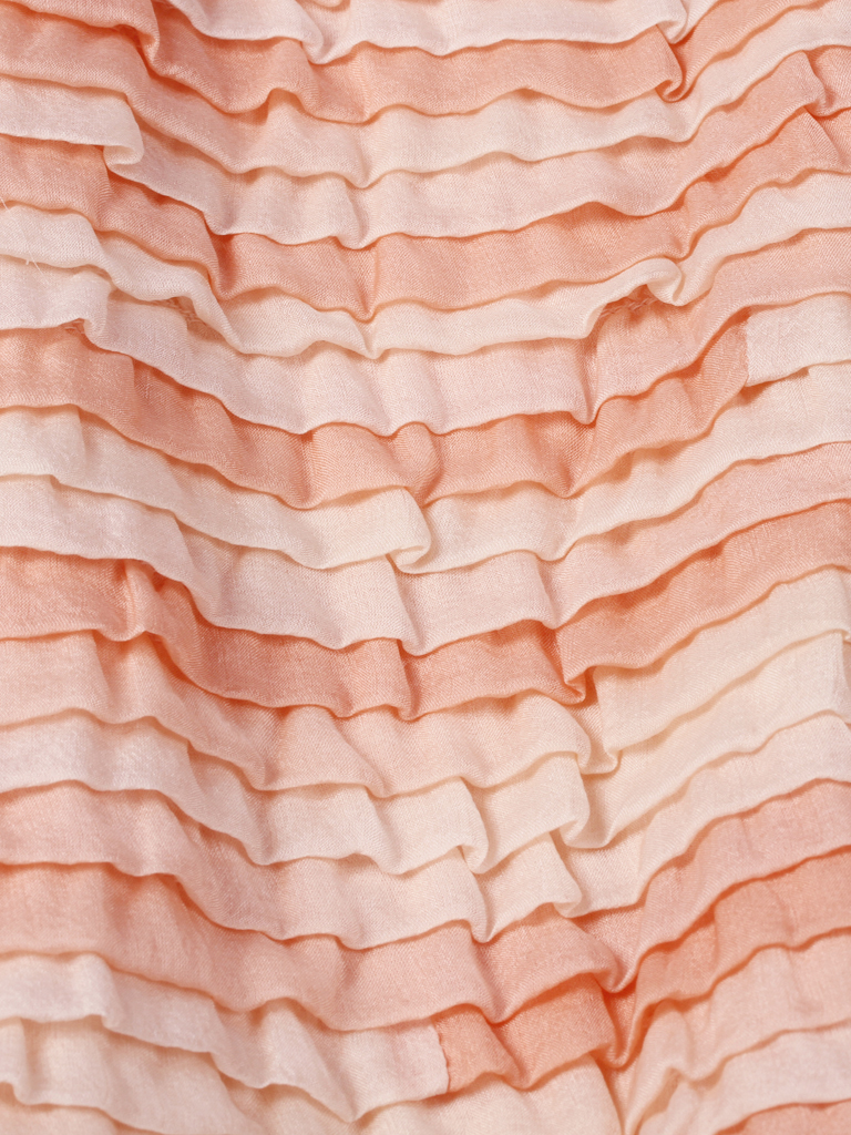 Silk Chiffon is cut into strips and hand dip dyed in two colours; the strips are then folded and constructed into the skirt. This tailoring method means that each one of this very small run is completely individual!