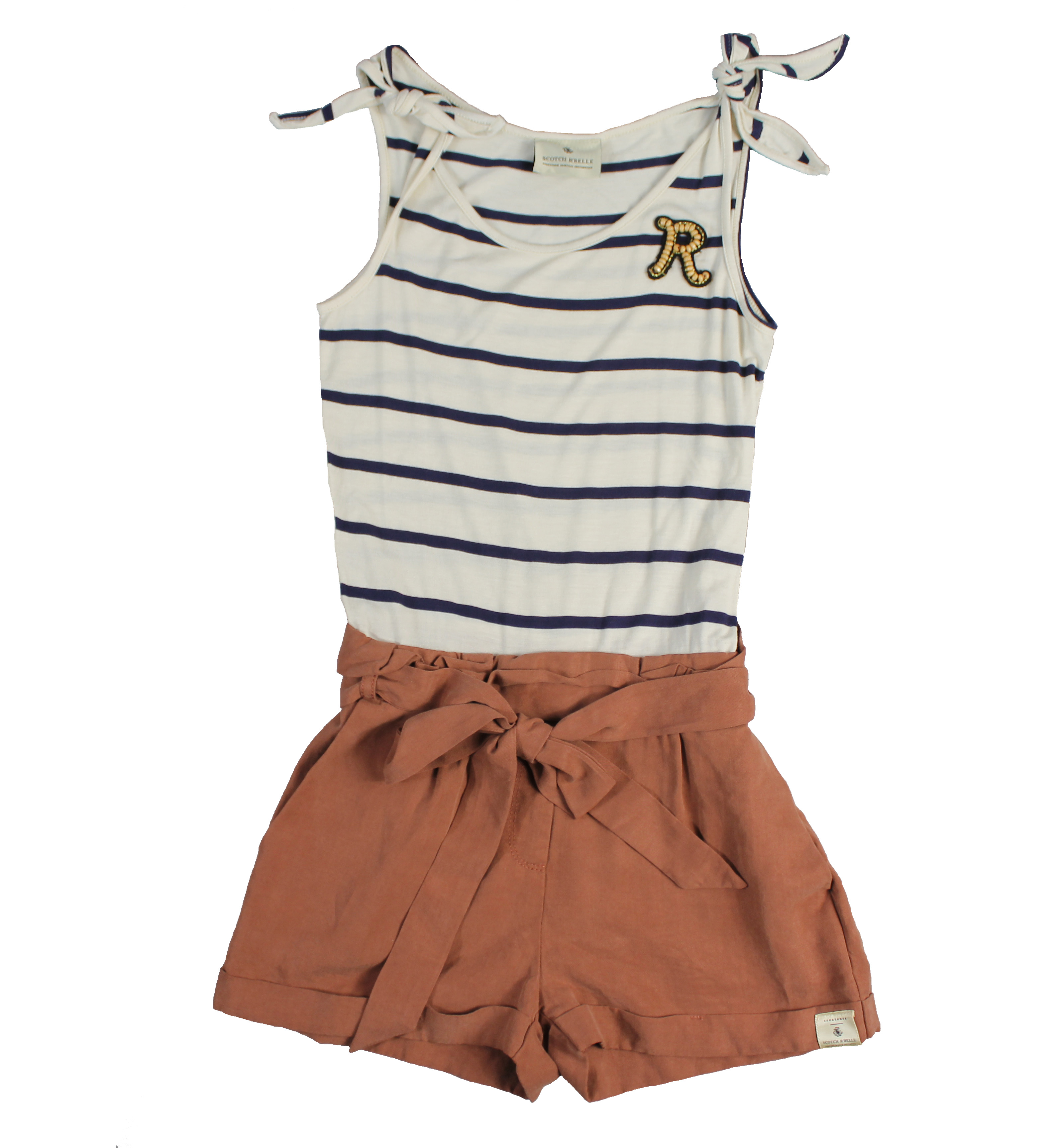 Sleeveless combo romper with shoulder ties and self belted cuff shorts.