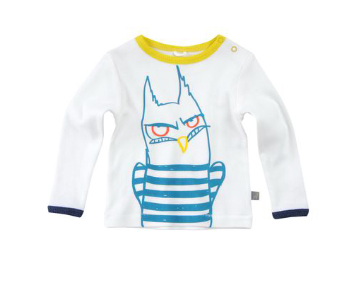 Organic cotton owl print interlock t-shirt with long sleeves, contrasting colors and snap button fastening at shoulder.