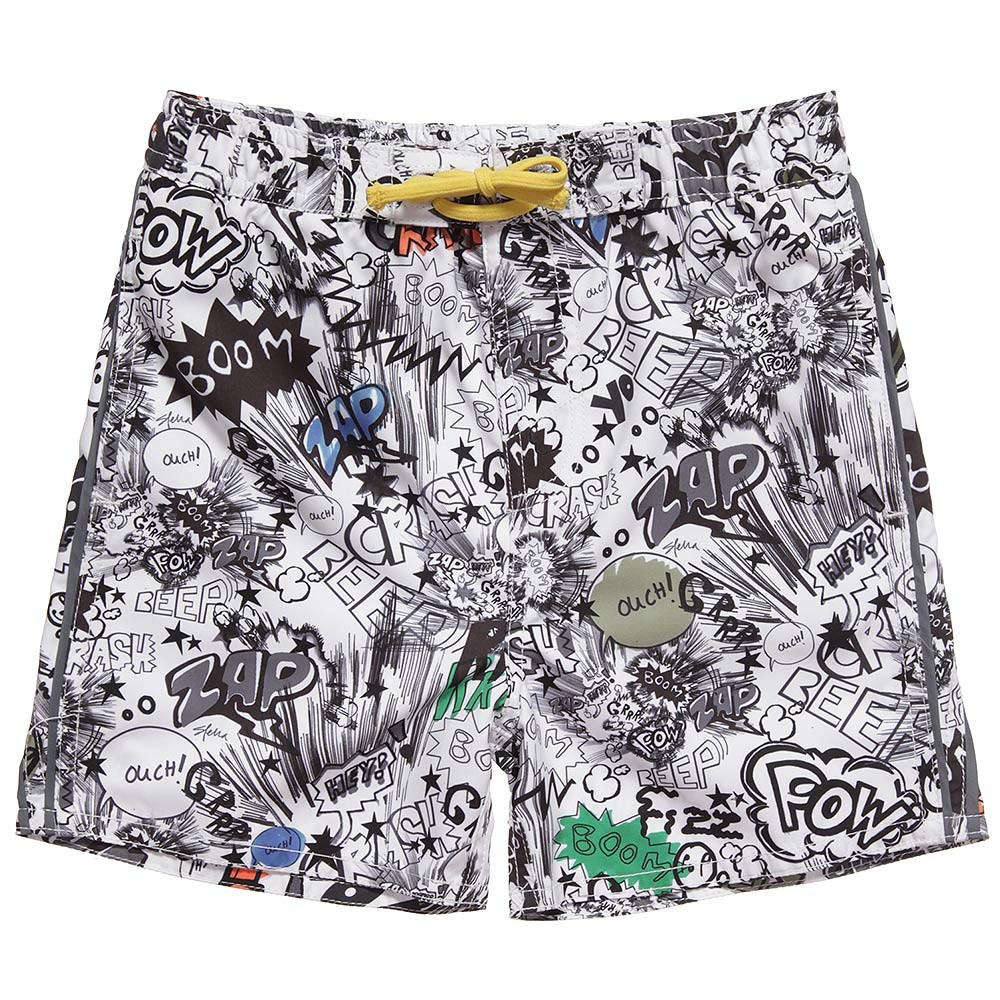 Swim shorts featuring an all over comic print. Elasticated waist with drawstring, inside mesh briefs and side pockets.