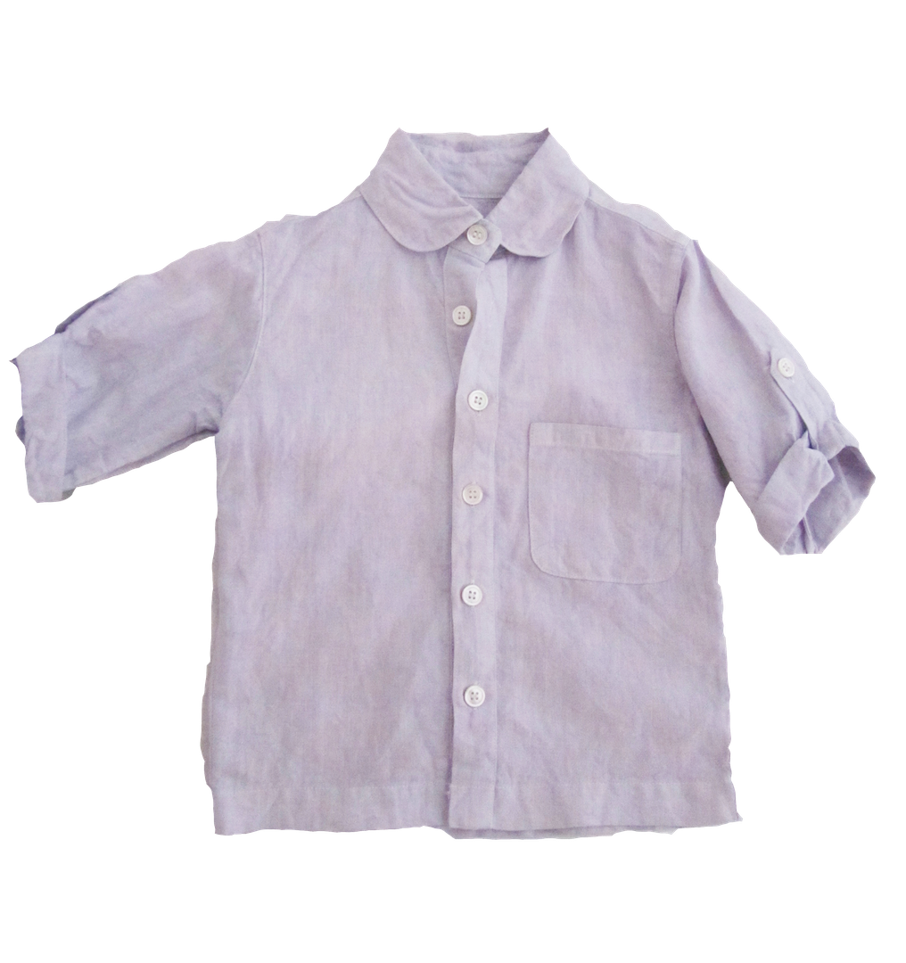 Beautiful organic cotton shirt with button up roll at the sleeve and peter pan collar. Made of hand dyed fabric.