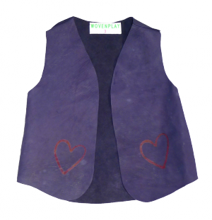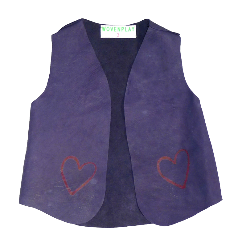 Hand-dyed leather vest with hand-printed sweet hearts at front.