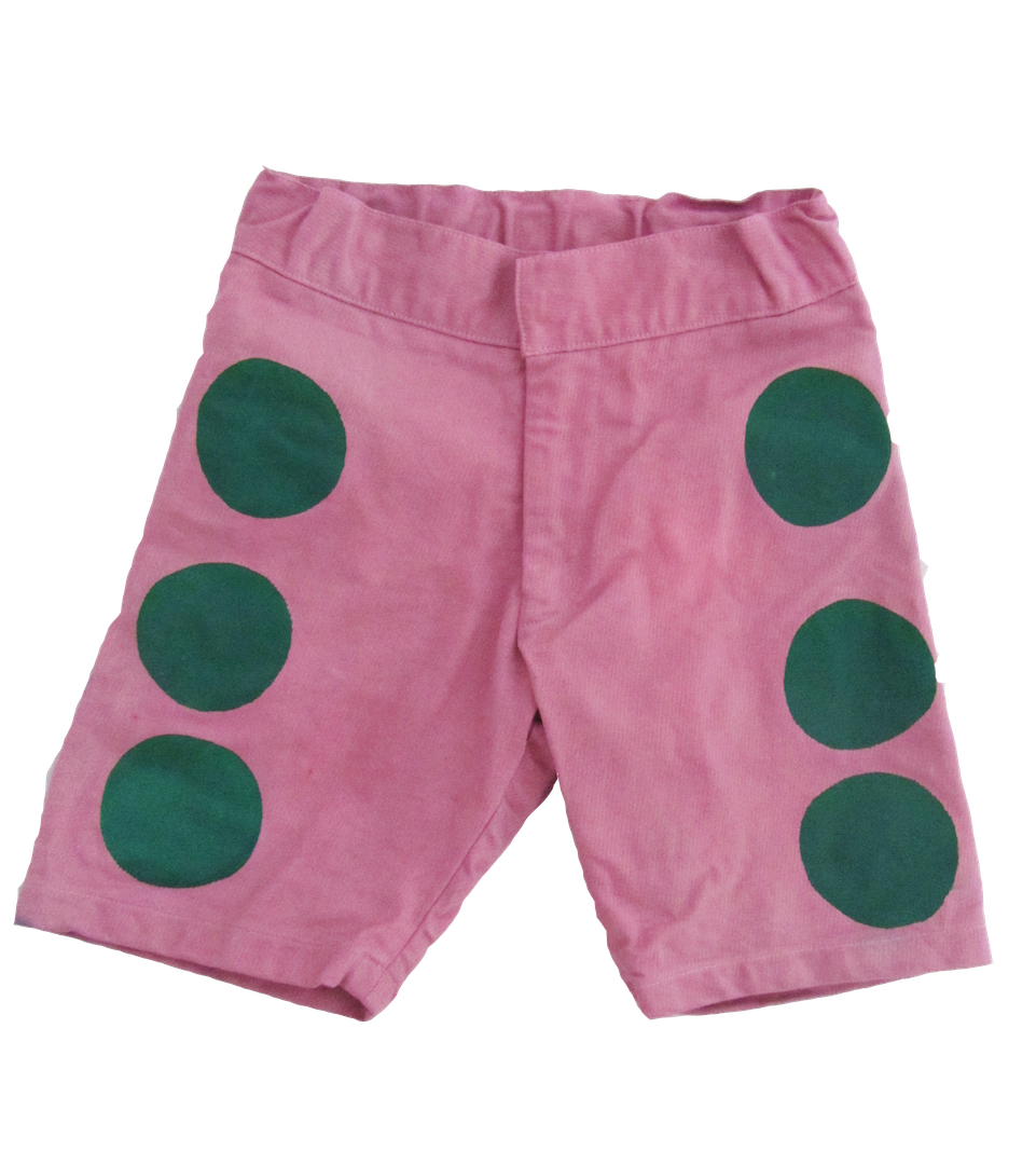 Super cute hand dyed bermudas with big and bold green dots at front. Adjustable waistband.